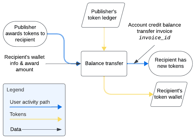The following diagram shows the process to award tokens to users by using the balance transfer operation.